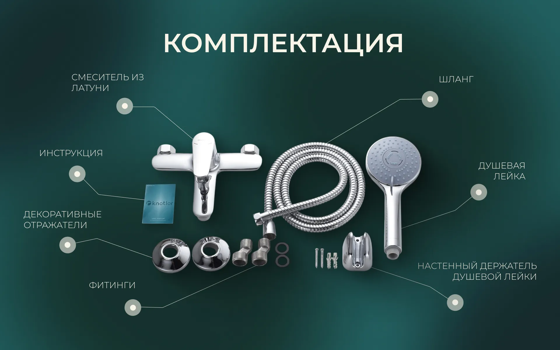 - Крепеж: Комплект латунных эксцентриков, резиновые уплотнители, держатель ручной лейки