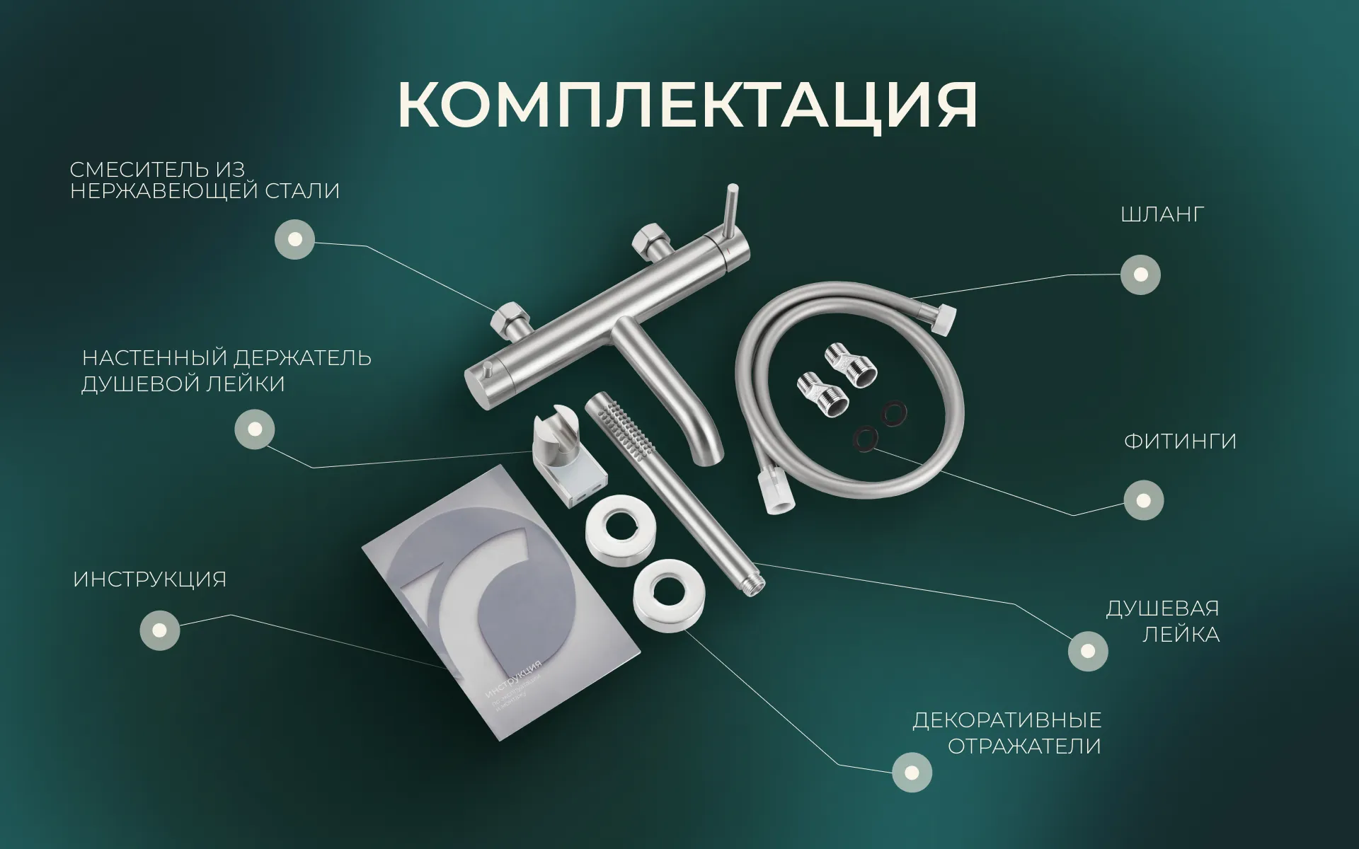 - Крепеж: Комплект эксцентриков из нержавеющей стали, резиновые уплотнители, держатель ручной лейки