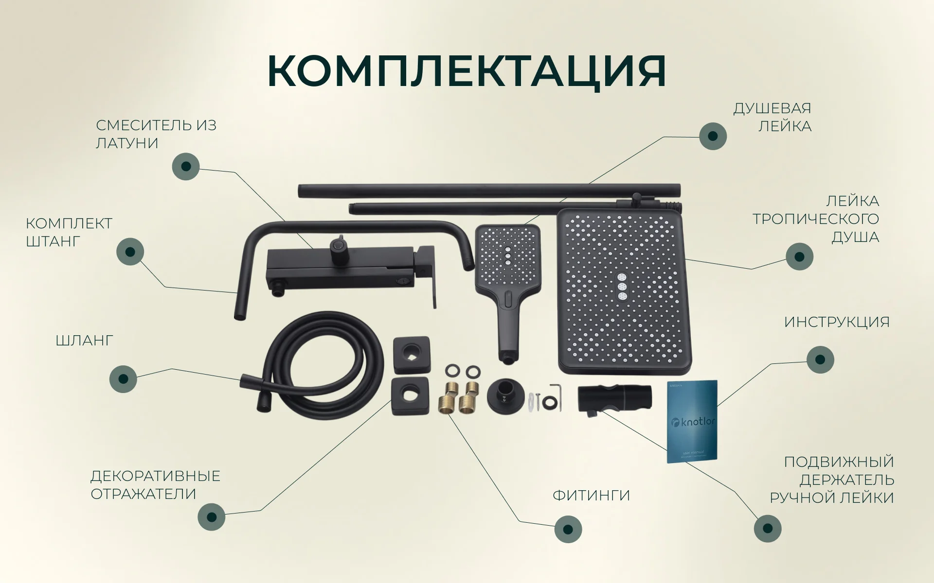 - Крепеж: Комплект латунных эксцентриков, резиновые уплотнители, держатель штанги тропического душа