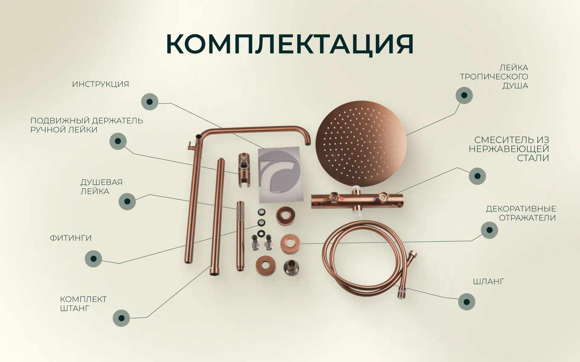- Крепеж: Комплект латунных эксцентриков, резиновые уплотнители, держатель штанги тропического душа