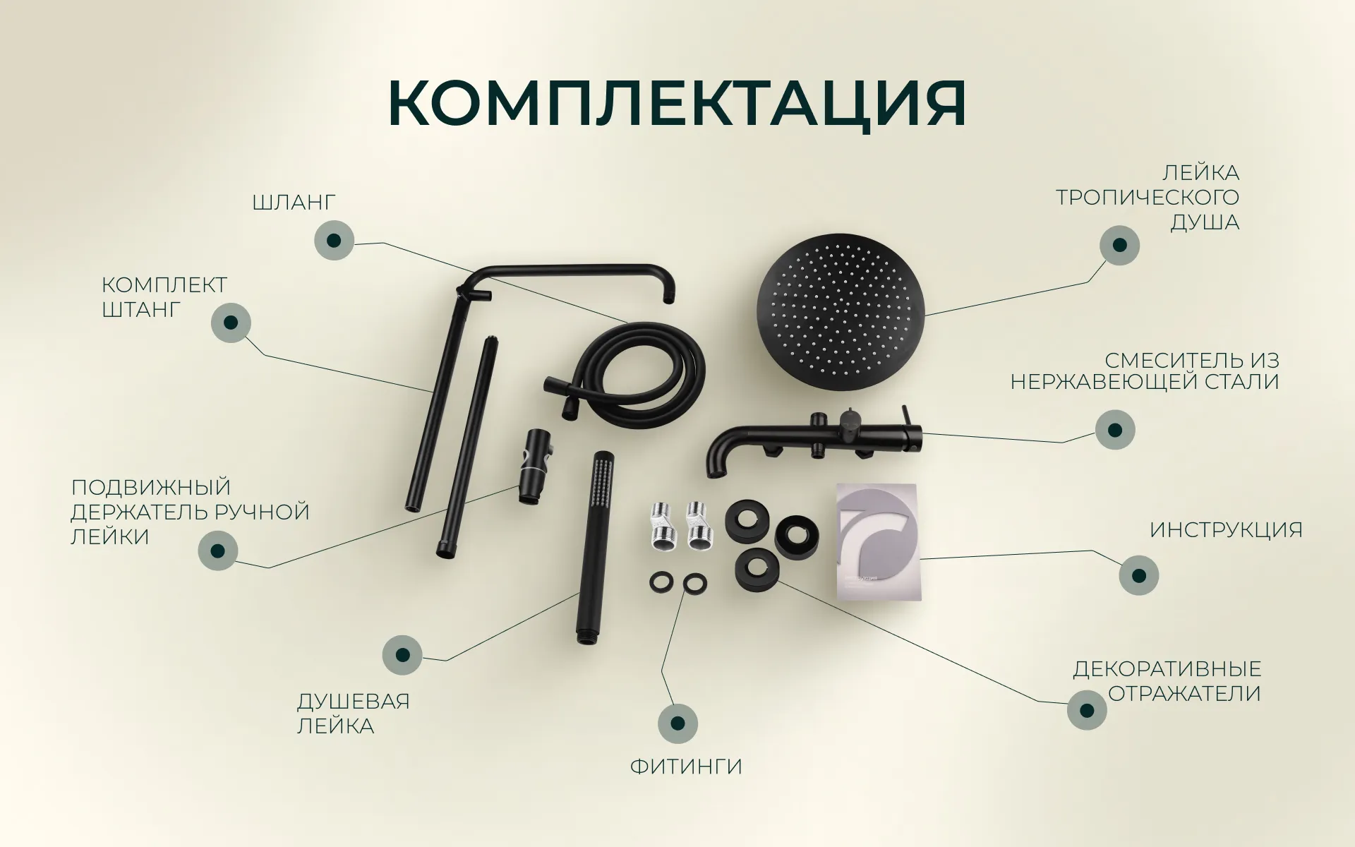 - Крепеж: Комплект латунных эксцентриков, резиновые уплотнители, держатель штанги тропического душа