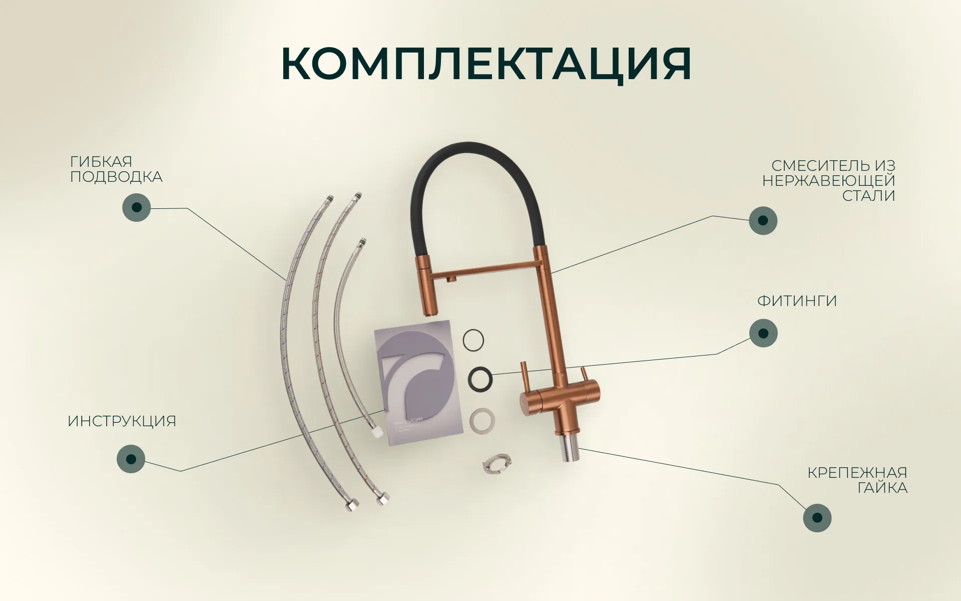 - Крепеж: Крепежная гайка, резиновые уплотнитель и прокладка