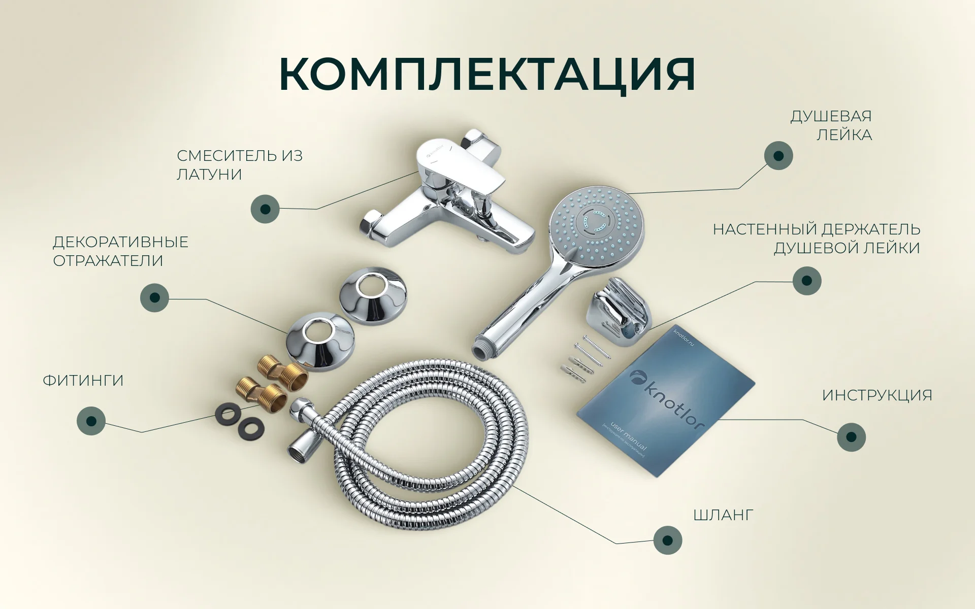 - Крепеж: Комплект латунных эксцентриков, резиновые уплотнители, держатель ручной лейки