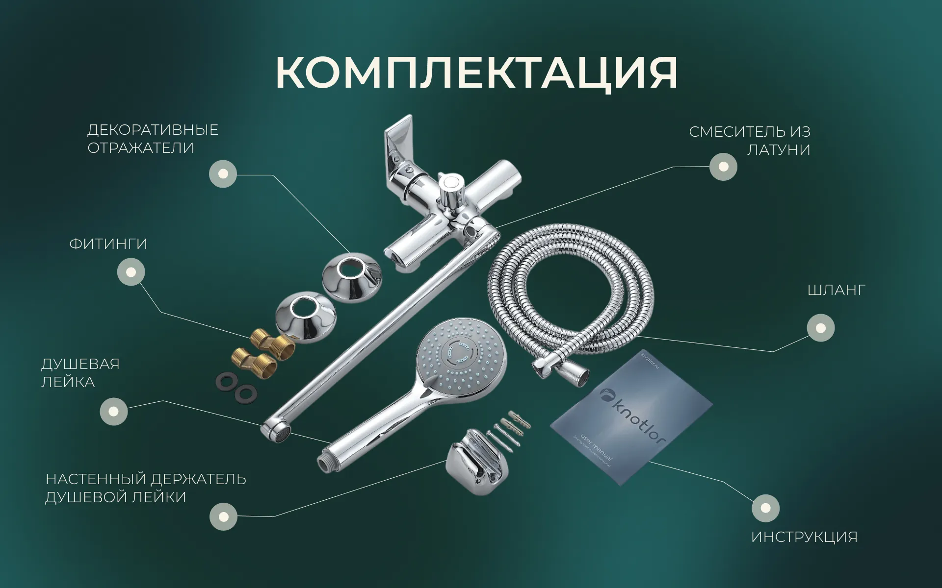 - Крепеж: Комплект латунных эксцентриков, резиновые уплотнители, держатель ручной лейки